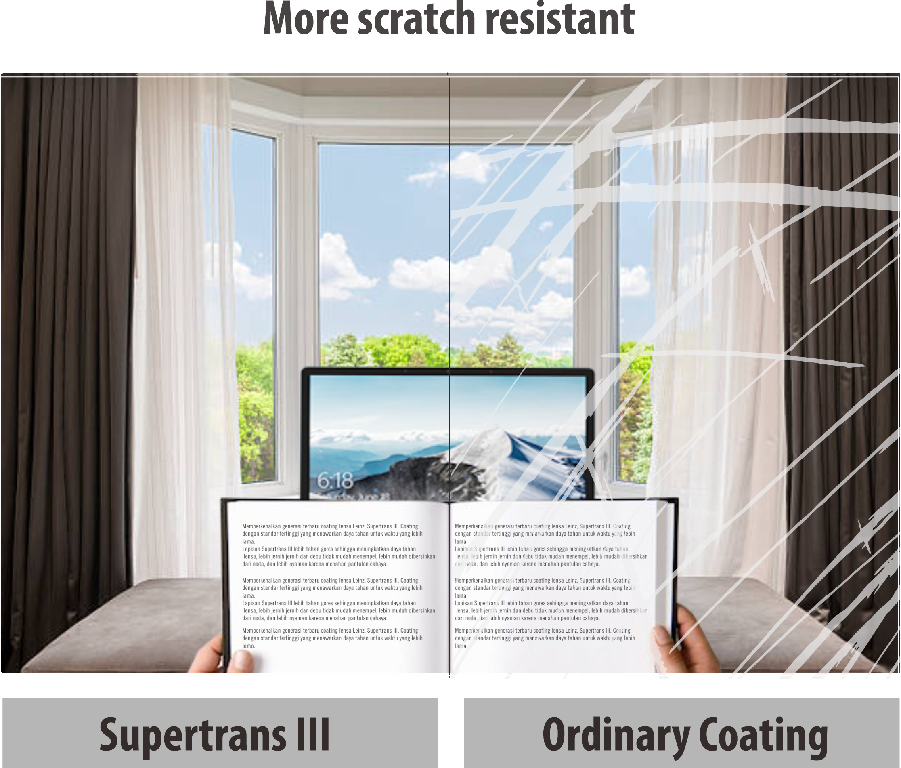 introducing the latest generation of Leinz lens coating, Supertrans III. Coating of the highest standard that offer durability for longer periods. Supertrans III layer more scratch resistant thus increasing the durability of the lens, clearer and dust does not easily stick, easier to clean from stains, and more comfortable because it withstand the reflection of light.